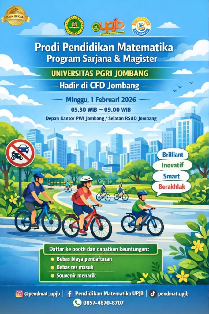 Masyarakat Jombang dan sekitarnya….segera mengunjungi both kami di CFD, Minggu 1 Pebruari 2026, dapatkan informasi menarik tentang Program Studi Pendidikan Matematika Program Sarjana dan Magister, dapatkan promo dan souvenirnya….kami tunggu