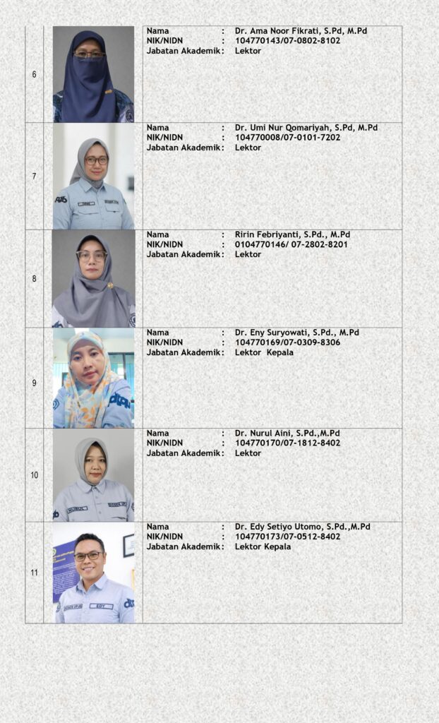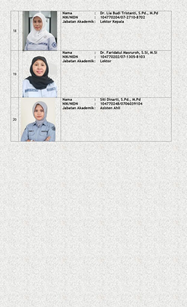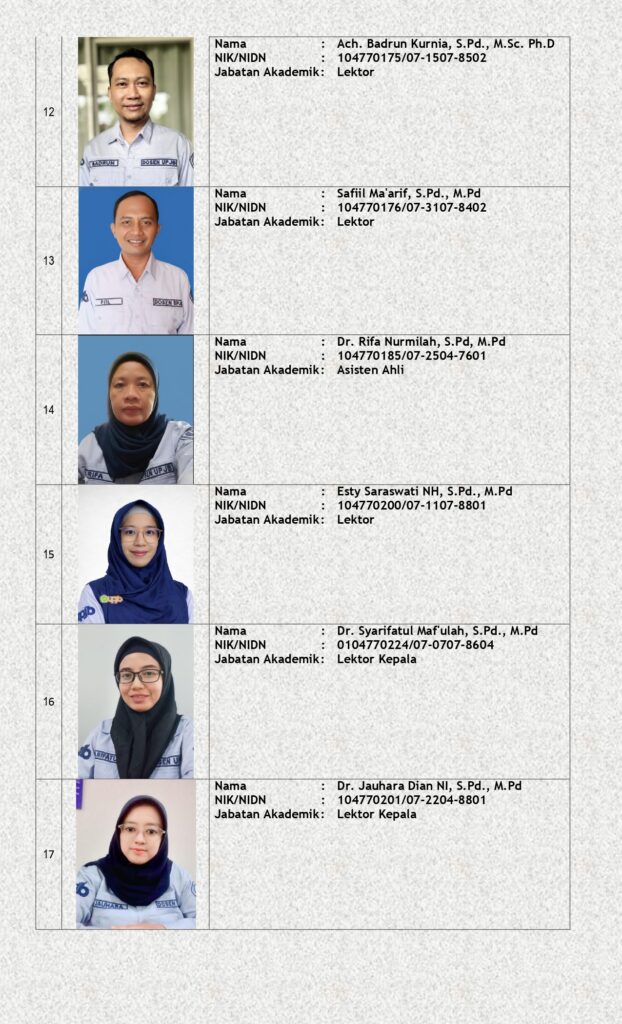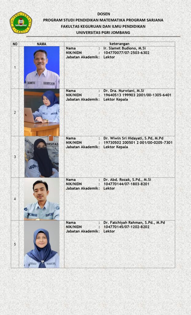 Dosen Program Studi Pendidikan Matematika merupakan Dosen Professional yang memenuhi kualifikasi Jabatan Fungsional Akademik dan kualifikasi Pendidikan Akademik. Dosen bergelar Doktor dan Magister, lulusan dari Perguruan Tinggi dalam dan luar Negeri. Dari 20 Dosen, 15 dosen bergelar Doktor, 1 dosen proses studi lanjut S3.